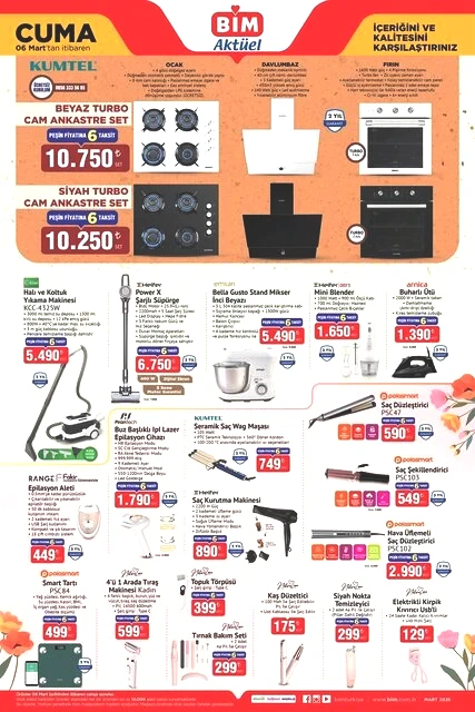 BİM'in gerçekleştirilecek aktüel ürünler kampanyası merakla bekleniyor. 6 Mart Cuma günü, mutfağını yenilemek isteyenler için beyaz renkli turbo cam ankastre setin fiyatı 10.750 TL, siyah versiyonunun ise 10.250 TL olarak belirlenmiş durumda. İşte BİM'in güncel aktüel ürünler kataloğunun detayları.